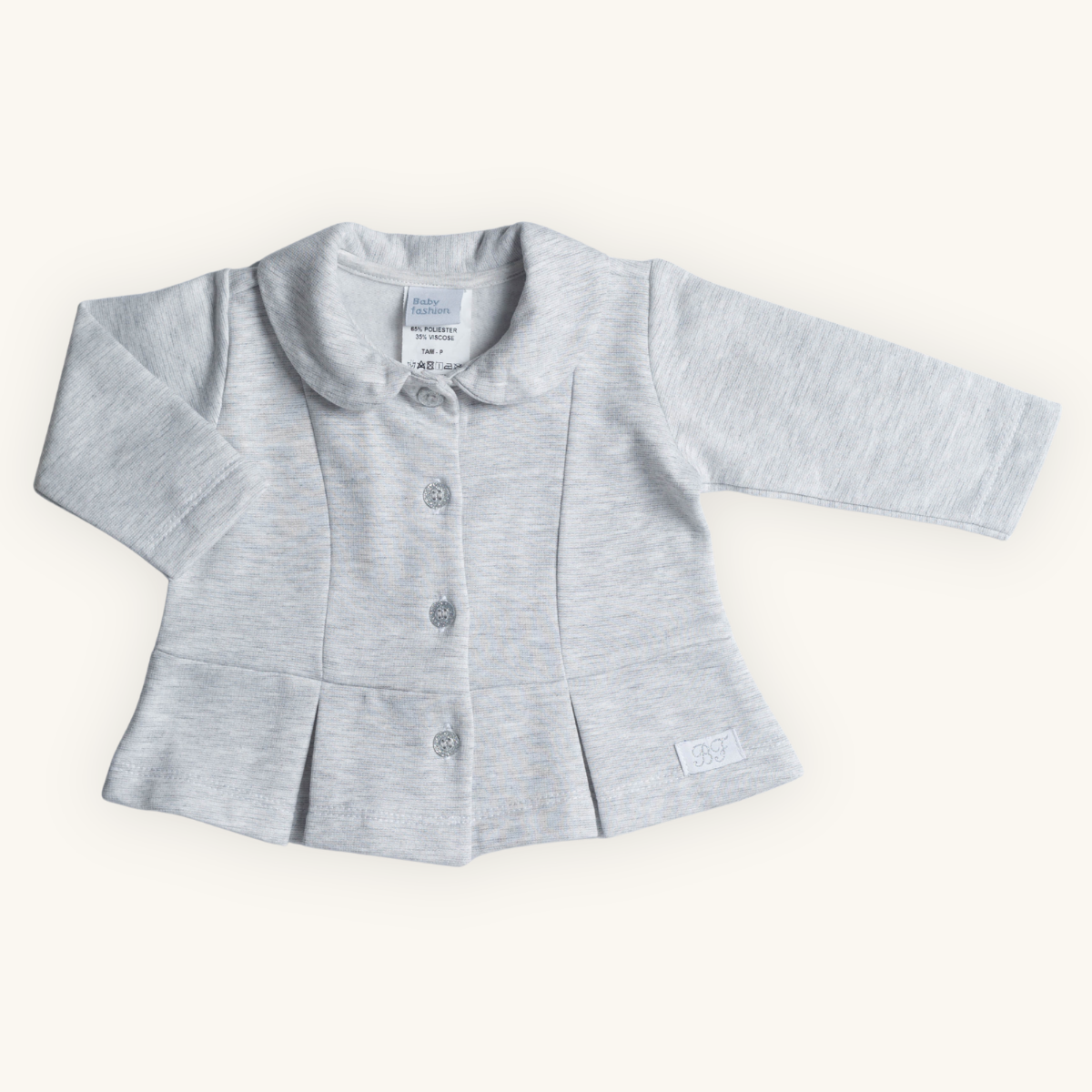 Feito em moletom felpado premium na cor mescla — um tom suave que mistura cinza e branco —, este casaco oferece um toque externo macio e um interior aveludado extremamente quentinho, perfeito para manter a bebê confortável sem pesar. O corte bem pensado garante liberdade de movimento para as pequenas descobertas do dia a dia.