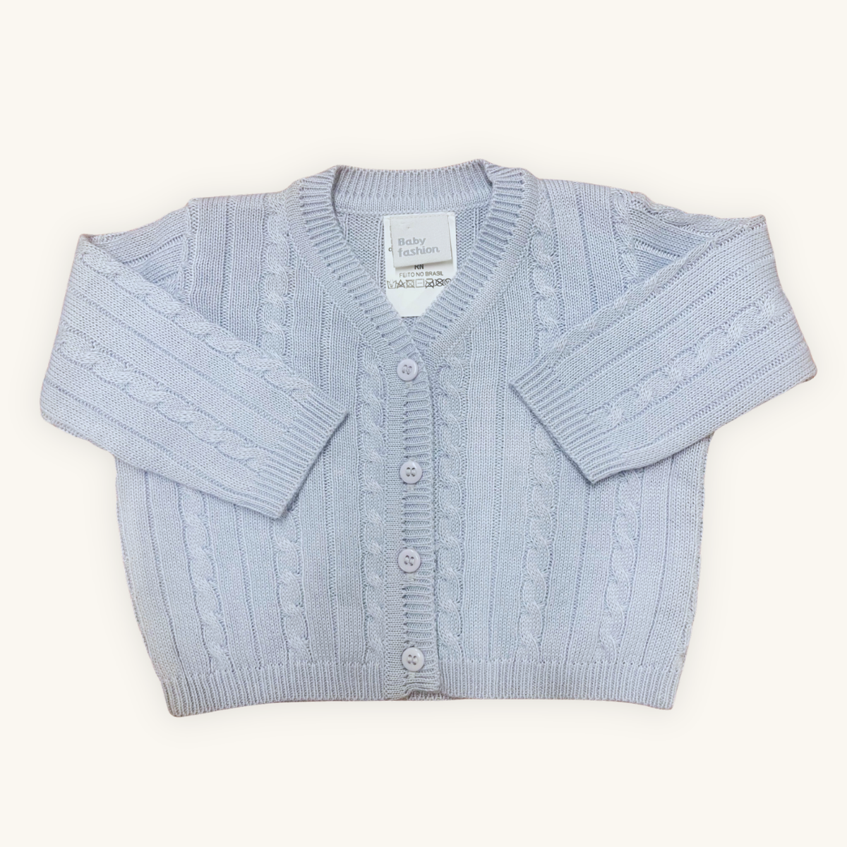 Feito em tricot premium no tom azul claro suave, este casaco apresenta um delicado padrão de tranças que traz textura refinada e movimento ao tecido. O tricot é macio, leve e com excelente caimento, oferecendo conforto térmico sem pesar, perfeito para os primeiros meses de vida.