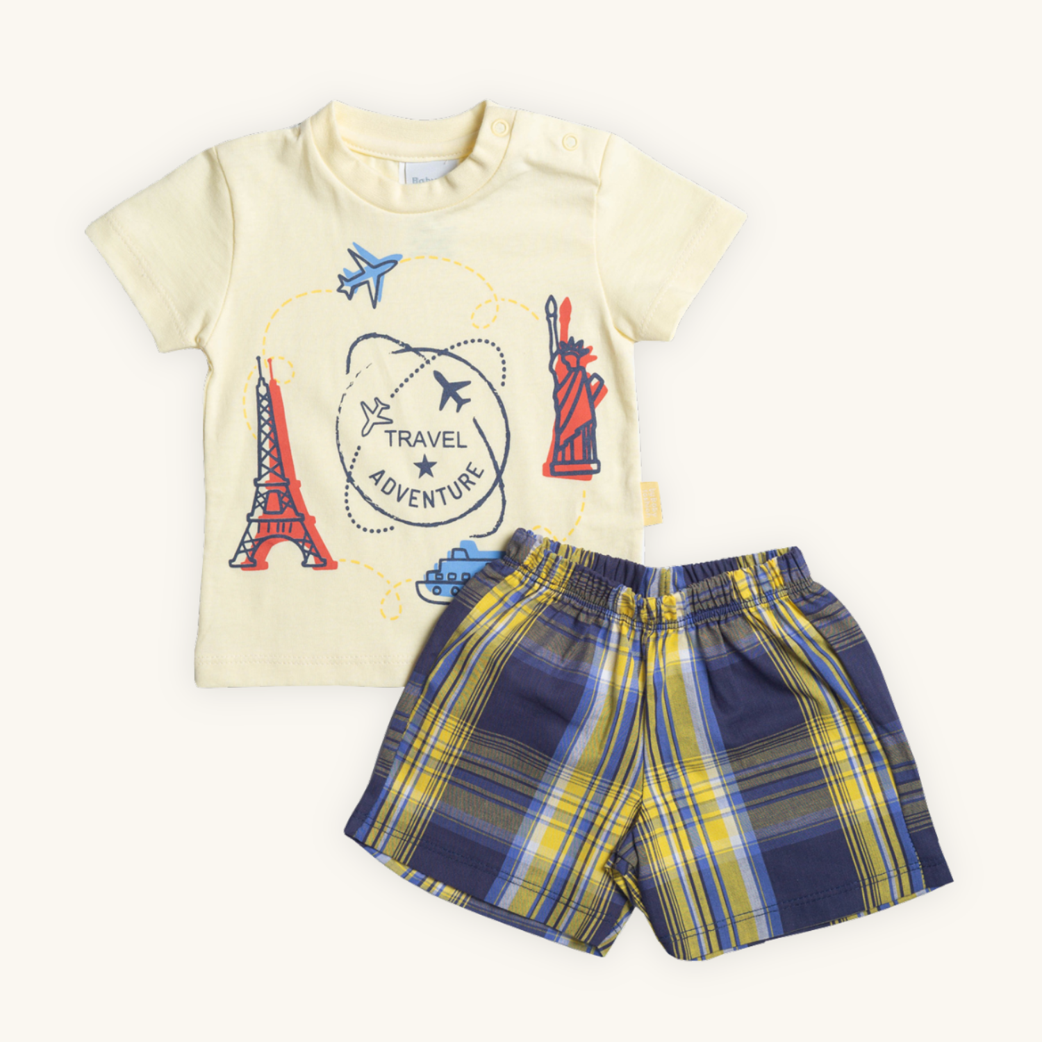A camiseta é confeccionada artesanalmente em meia malha 100% algodão, com toque macio e estampa divertida que lembra uma mini viagem pelo mundo. Já o short em tricoline 100% algodão, com padronagem xadrez clássica, tem caimento leve e cós confortável — perfeito para se movimentar com liberdade.