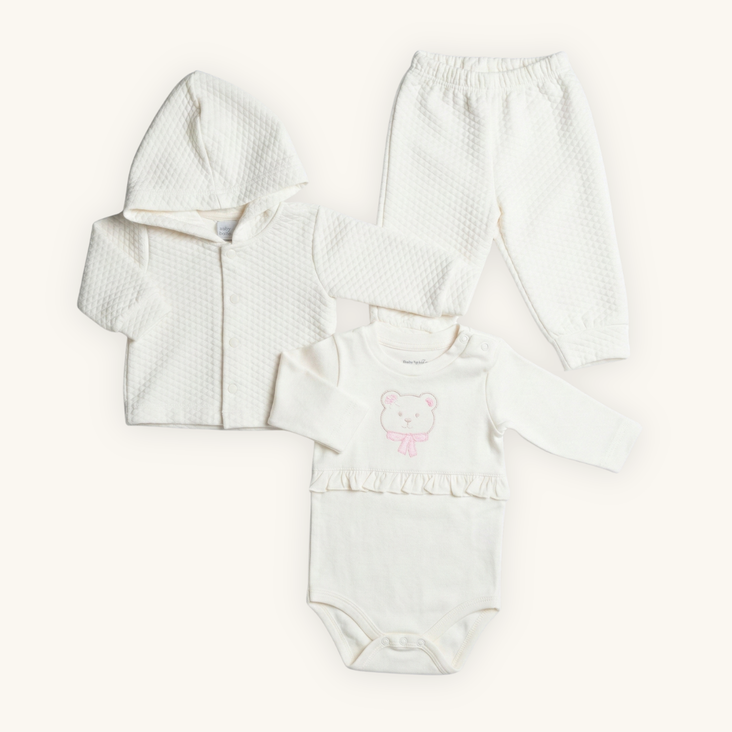 Esse kit é composto por 1 body de manga longa em suedine 100% algodão e 1 conjunto de calça e casaco em matelassé.