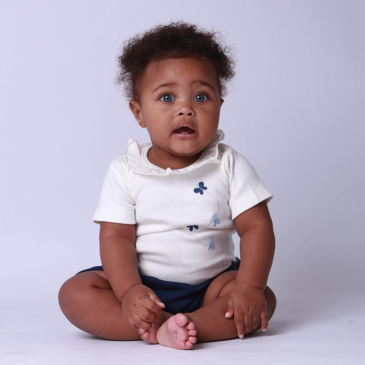 O body possui gola com babadinho em meia malha, dando um ar sofisticado e encantador. Na parte frontal, um bordado artesanal de borboletas delicadas enfeita a peça, criando um visual leve e apaixonante. Para completar, o short azul-marinho traz um contraste clássico, confortável e fácil de combinar.