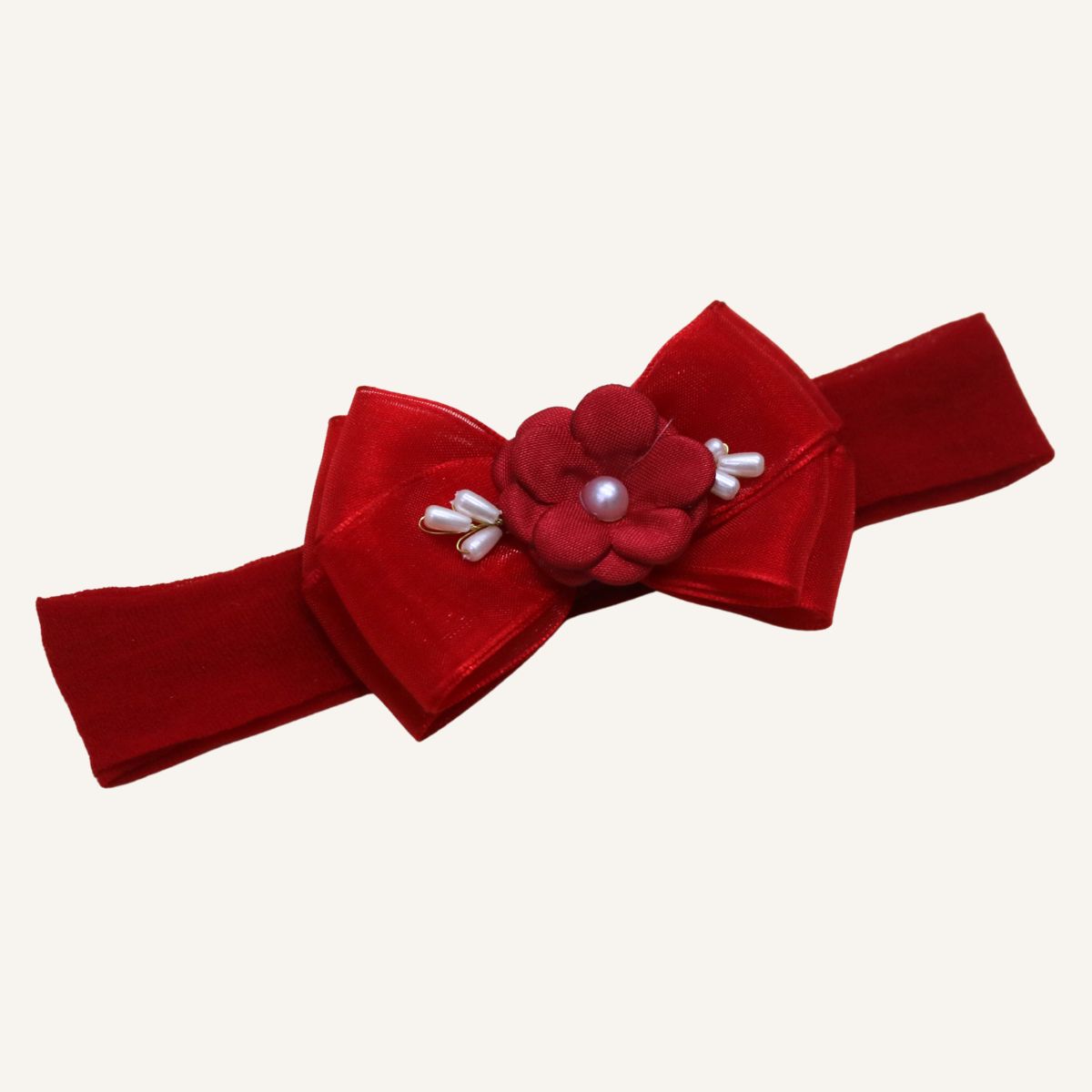 O destaque fica para o laço duplo em cetim, elegante e sofisticado, com aplicação de pérolas sintéticas que trazem brilho delicado. No centro, uma flor artesanal com pérola aplicada dá o toque final de fofura e elegância.