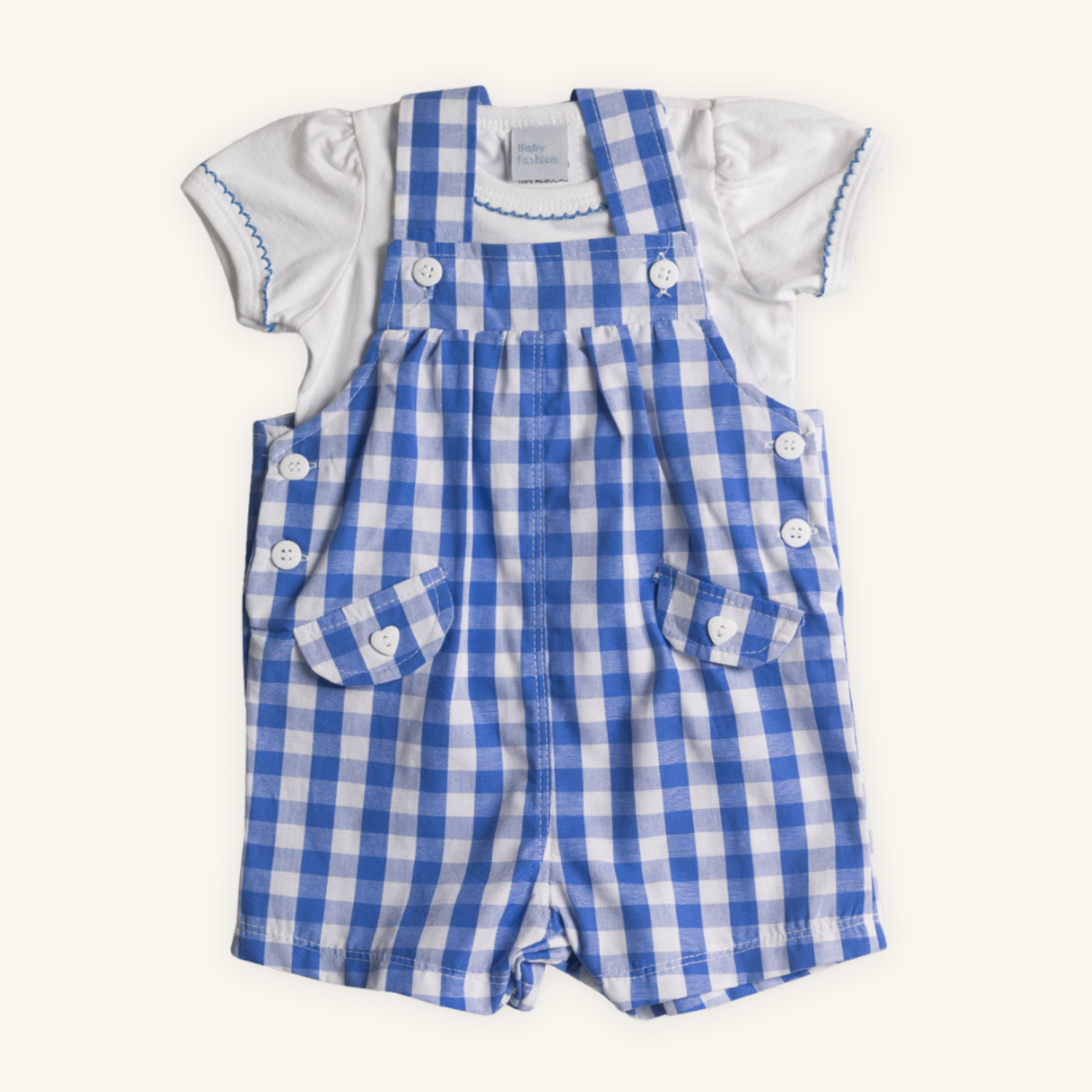 Jardineira confeccionada artesanalmente em tecido plano xadrez super macio e leve, possui botões de abertura na lateral e no entre pernas. Seu diferencial está nas alças reguláveis por botões. Acompanha uma camiseta, com detalhe de picueta nas manguinhas e gola, e possui botão na gola para facilitar o vestir.