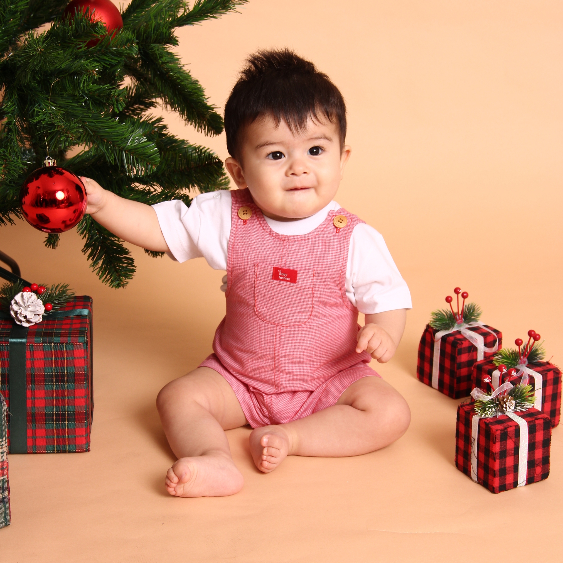 A jardineira é confeccionada em Tricoline 100% Algodão no tradicional padrão xadrez Vichy vermelho, símbolo de elegância atemporal. Ela traz detalhes que fazem toda a diferença: botões de madeira ajustáveis em dois níveis para acompanhar o crescimento do bebê e abertura no entrepernas, que facilita a troca de fraldas com praticidade.