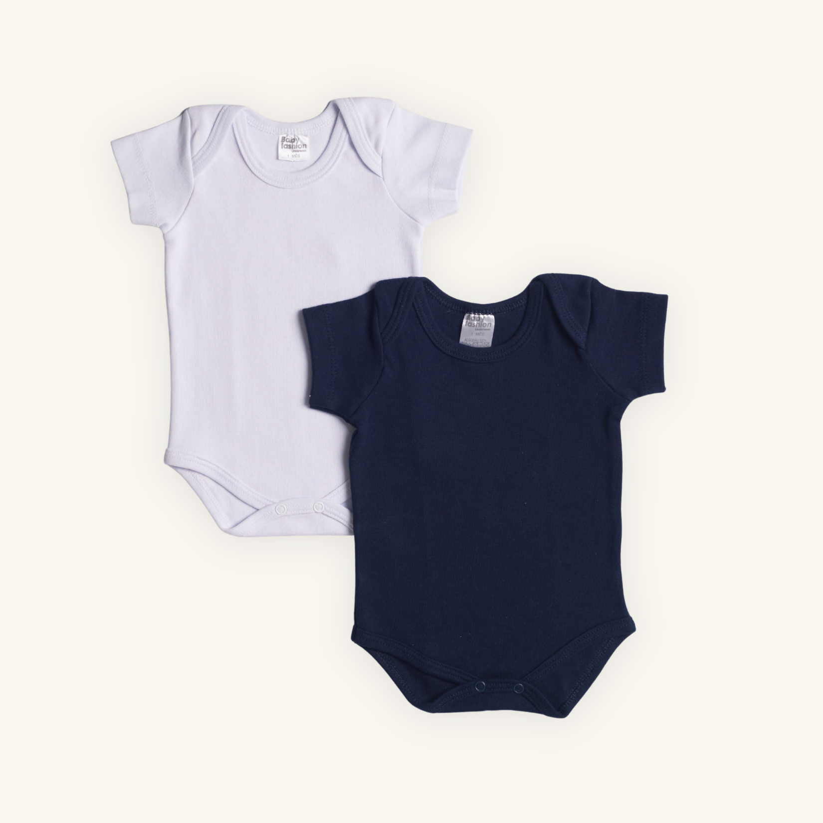 Esse kit é composto por 2 bodies de manga curta, sendo um na cor Azul Marinho e outra na cor Branca.
