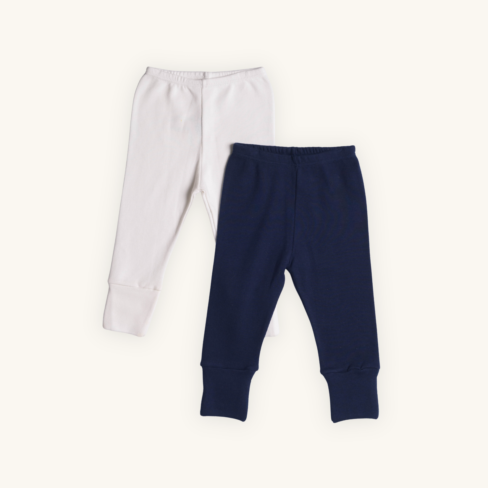 Esse kit é composto por 2 calças com pé reversível, sendo uma na cor azul marinho e outra na cor branca.