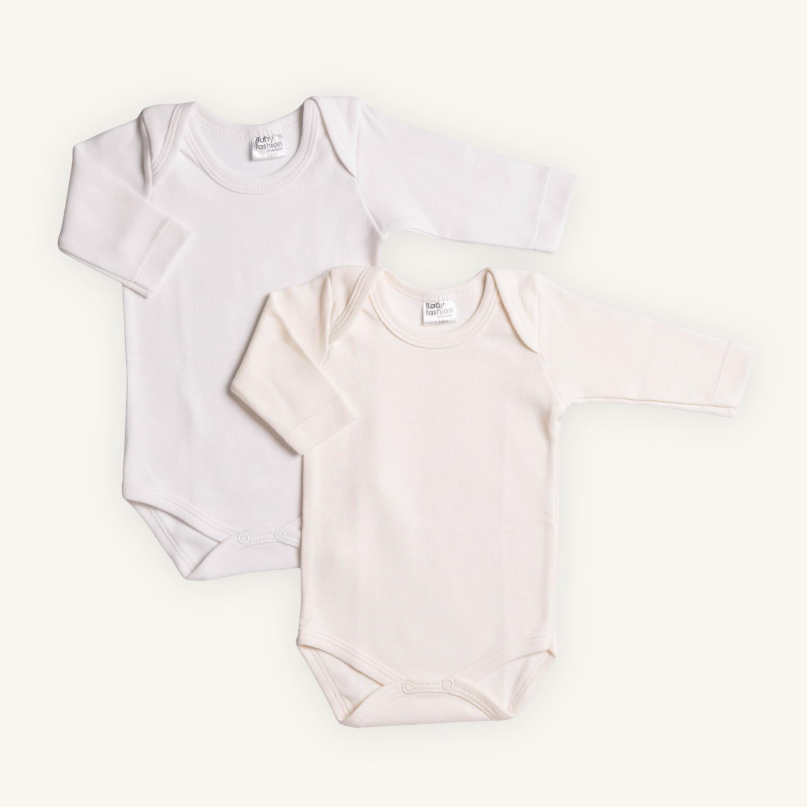 Esse kit é composto por 2 bodies de manga longa, sendo um na cor Cru e outra na cor Branca.