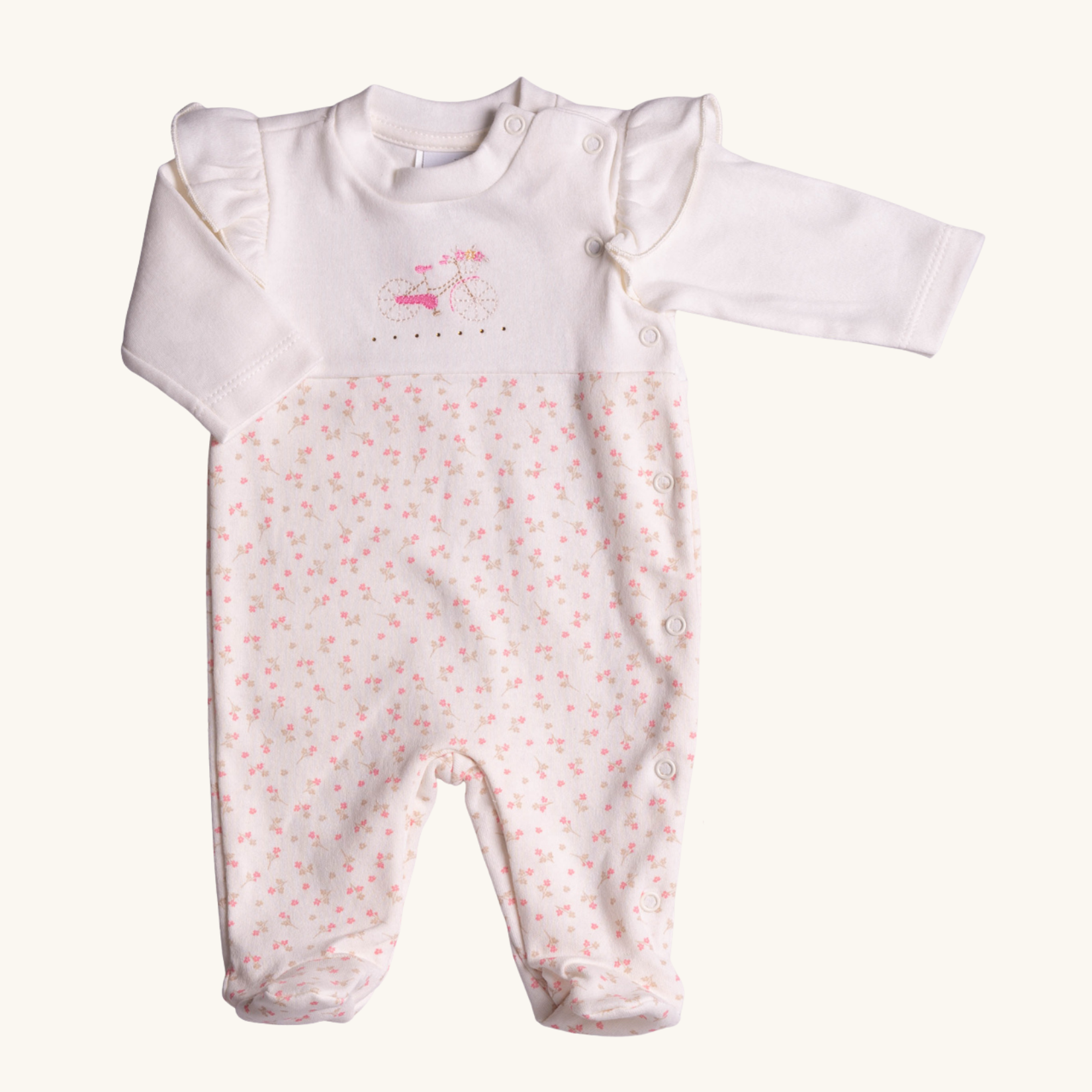 Confeccionado artesanalmente em Suedine Premium 100% algodão, ele abraça o corpinho do bebê com um toque macio e aconchegante, ideal para os primeiros passeios ou momentos especiais em casa. O bordado artesanal de bicicletinha na pala vem com brilhinhos delicados que encantam à primeira vista — e o melhor: o avesso do bordado é forradinho, pra não incomodar a pele sensível da sua pequena.