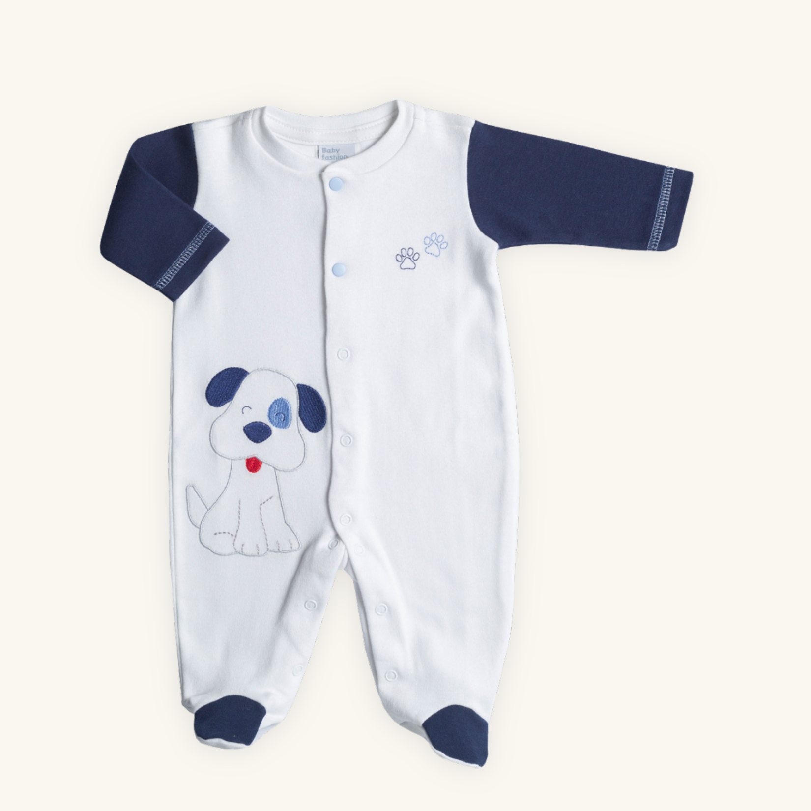 Esse macacão une conforto, delicadeza e muito charme em uma peça só. Com mangas e pezinhos contrastantes na cor azul marinho, ele se destaca pelo bordado artesanal fofo de cachorrinho — forrado internamente com malha para proteger a pele sensível do bebê.