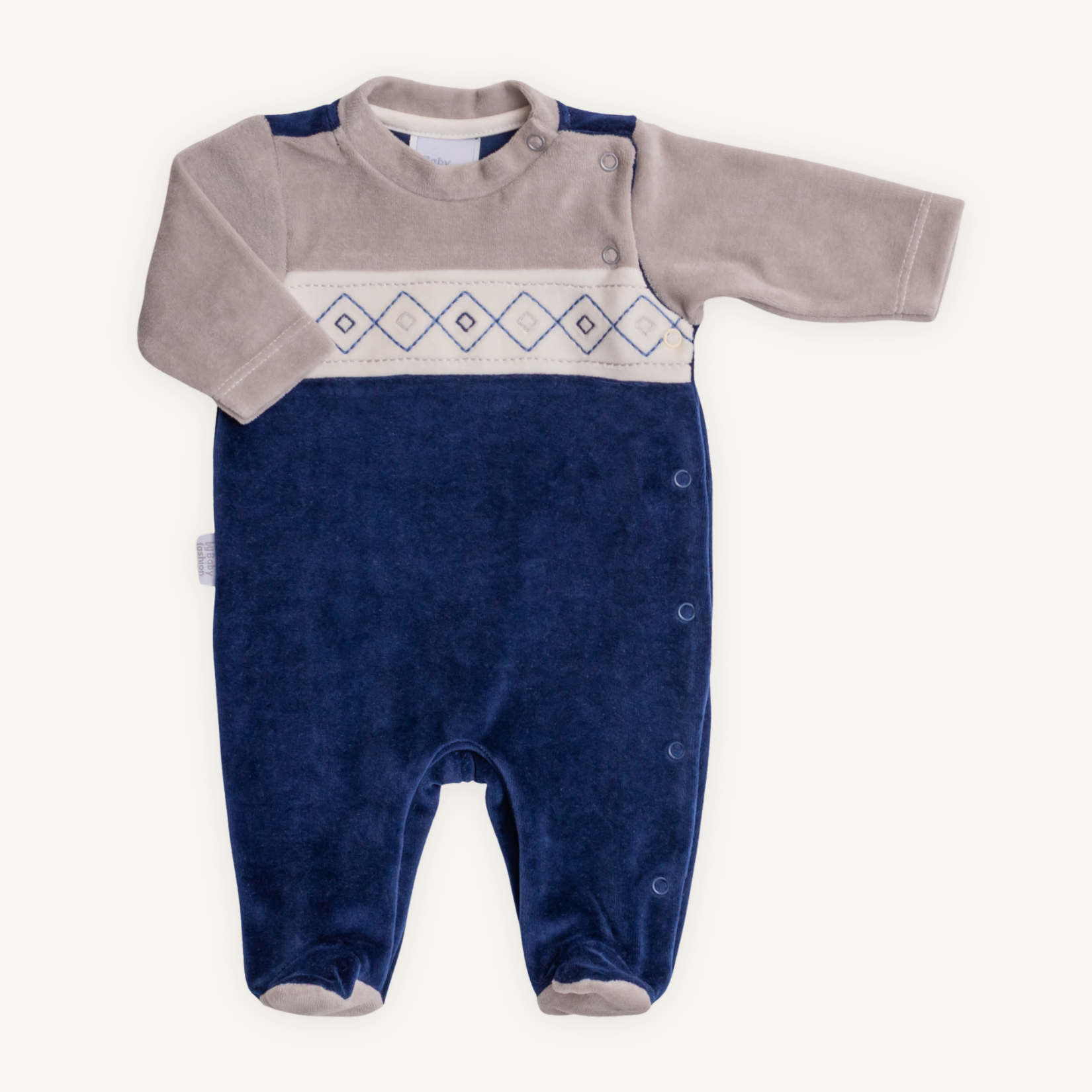 O charme começa pelas cores elegantes: azul marinho profundo na base, com pala em tom cru e detalhe cinza que aparece também nas manguinhas e na solinha dos pezinhos. Um equilíbrio perfeito entre o tradicional e o contemporâneo.