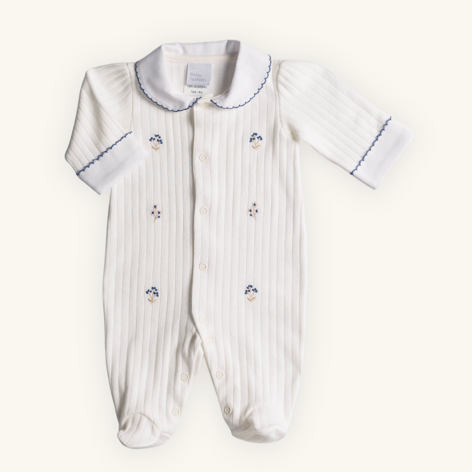 O grande destaque são os bordados artesanais salpicados de florzinhas azuis –leves, delicados e exclusivos que trazem sofisticação e ternura à peça, forrados individualmente para garantir proteção extra à pele do bebê. A gola e os punhos em fustão com acabamento em picueta criam um contraste refinado e clássico, enquanto a abertura entrepernas com botões garante trocas rápidas e práticas sem perder a elegância.