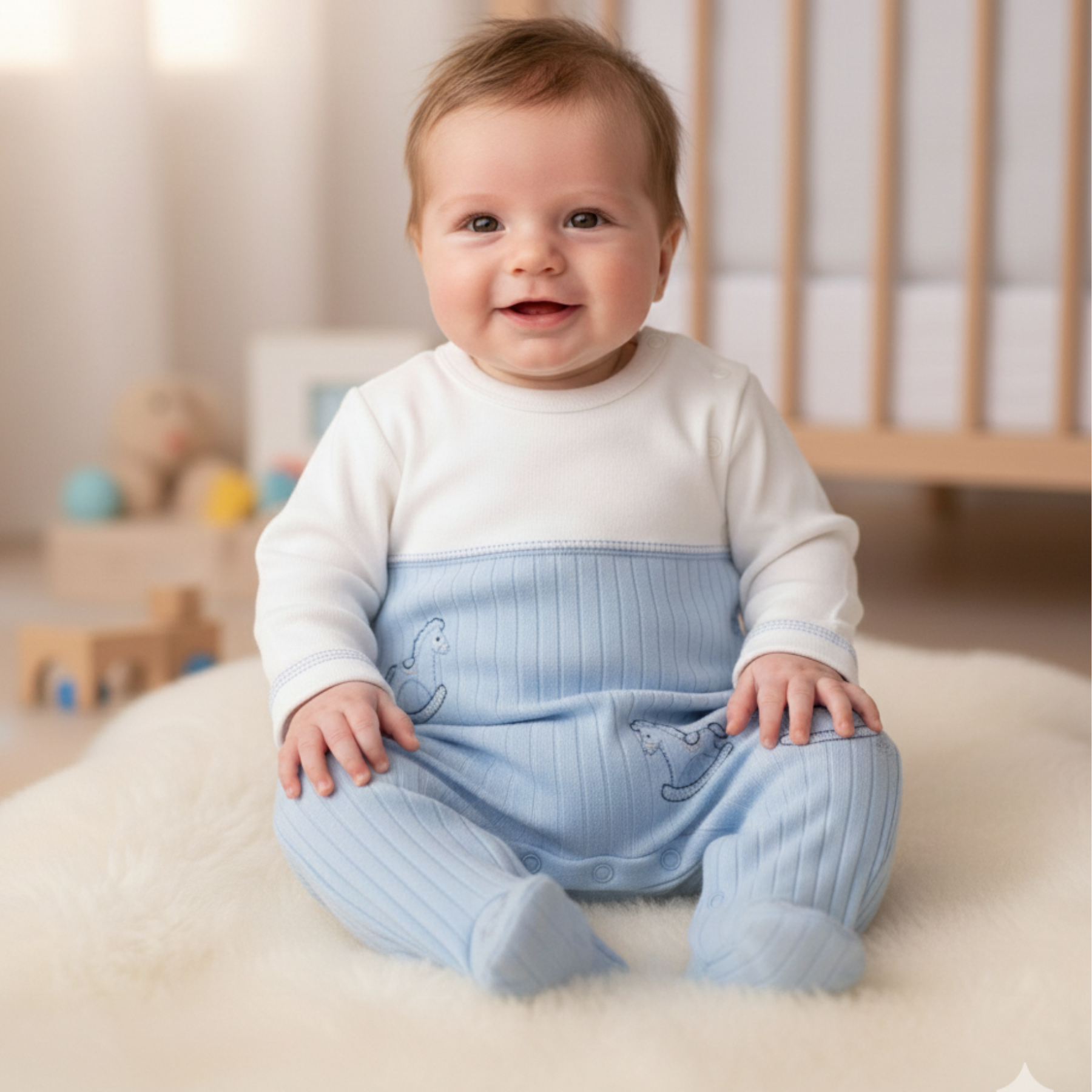 A parte superior e mangas em tom cru liso trazem delicadeza neutra, enquanto a parte inferior em azul claro canelado adiciona textura charmosa e frescor. O grande destaque são os bordados leves e lindos de cavalinho de pau (cavalo de balanço) no corpo e nos pezinhos – detalhes artesanais que trazem um charme incomparável e delicadeza sem igual. Todos os bordados são forrados com malha macia por dentro, protegendo a pele sensível do bebê.