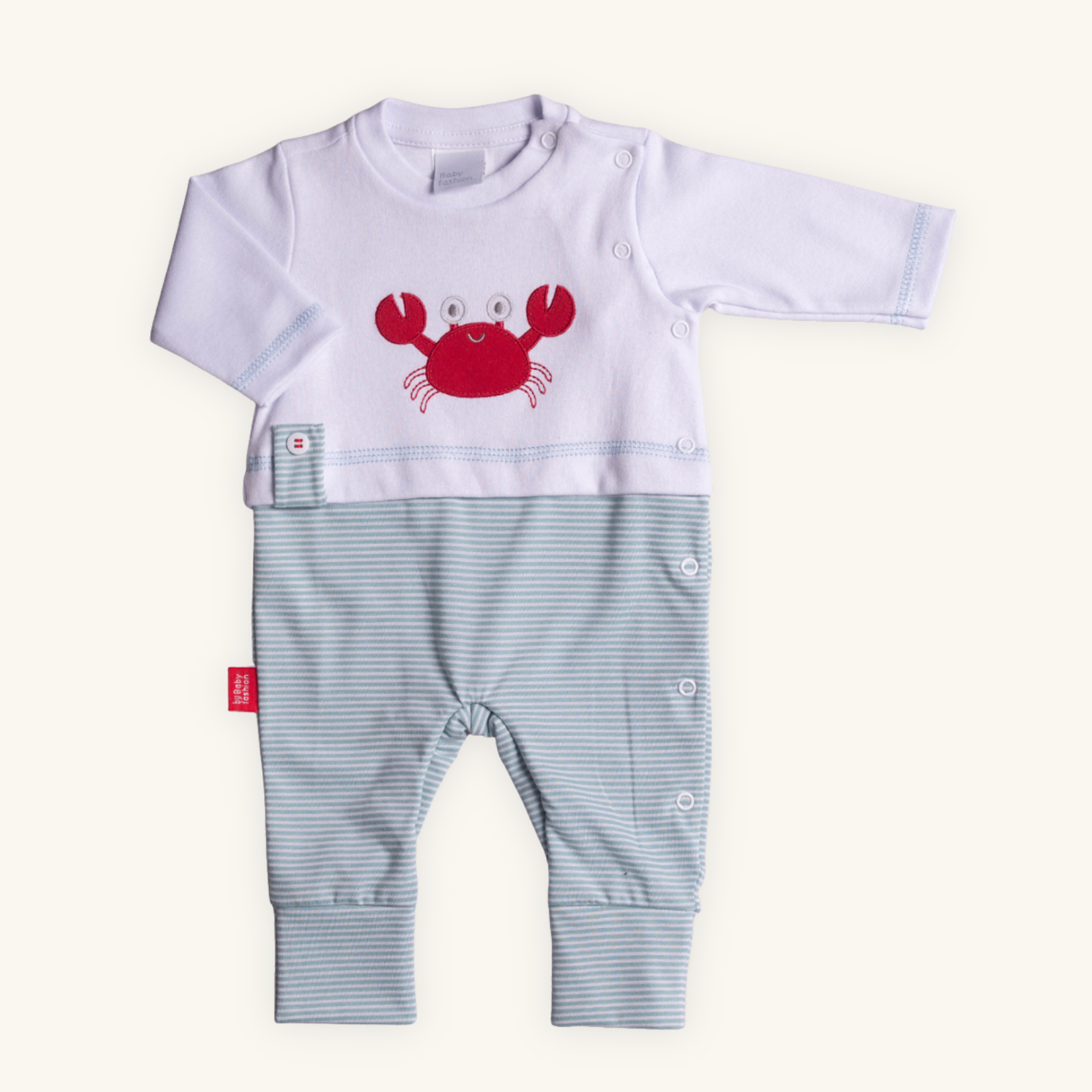 O charme deste macacão reside no bordado artesanal de siri, que possui uma forração de malha interna para que o bordado nao entre em contato com a pele do bebe.
