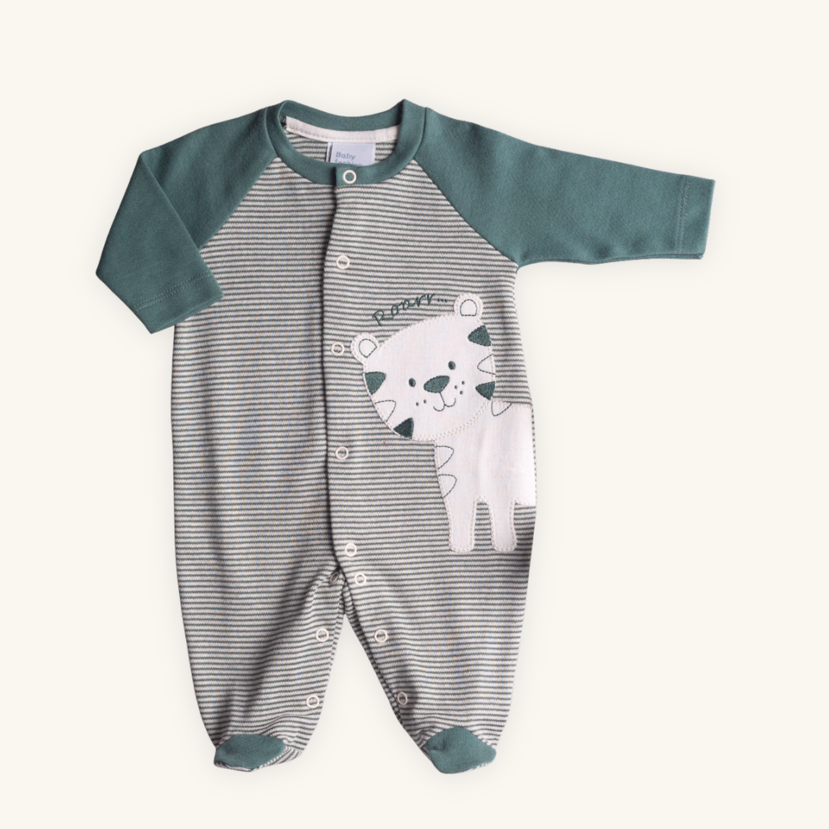 O charme começa pela combinação de cores: verde selva com listrado mescla, que traz aquele ar moderno e descolado. O bordado artesanal lateral do tigre é um verdadeiro destaque — além de lindo, vem com forro interno em malha, que protege a pele delicada do bebê de qualquer atrito.