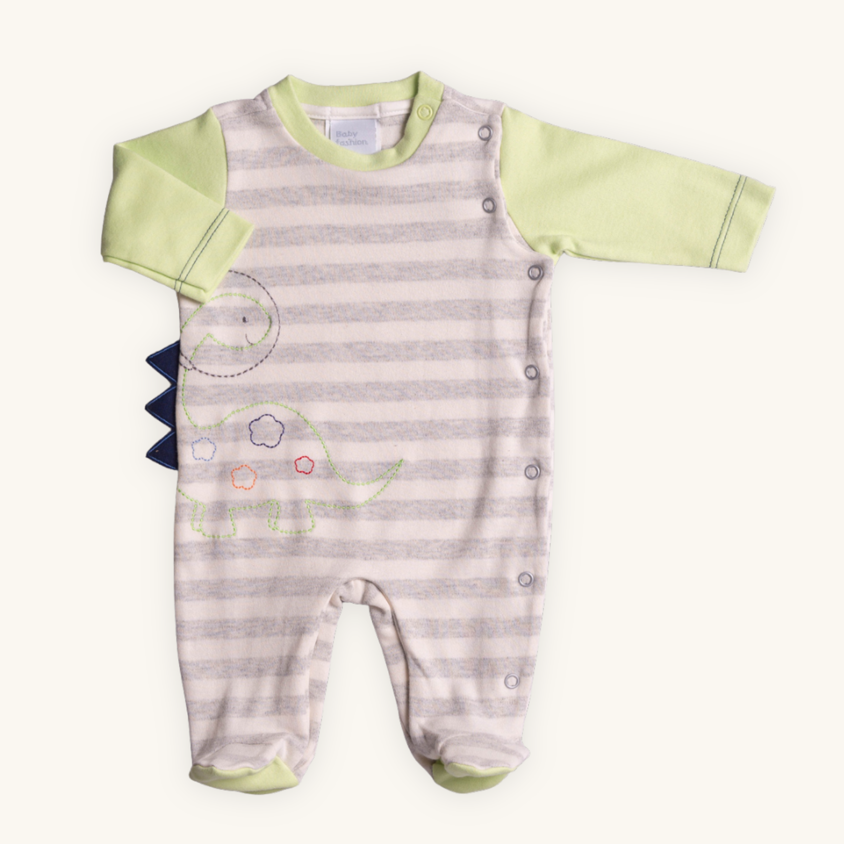 O charme deste macacão fica na “barbatana” do dinossauro, soltinha na lateral, e na combinação incrível de cores.