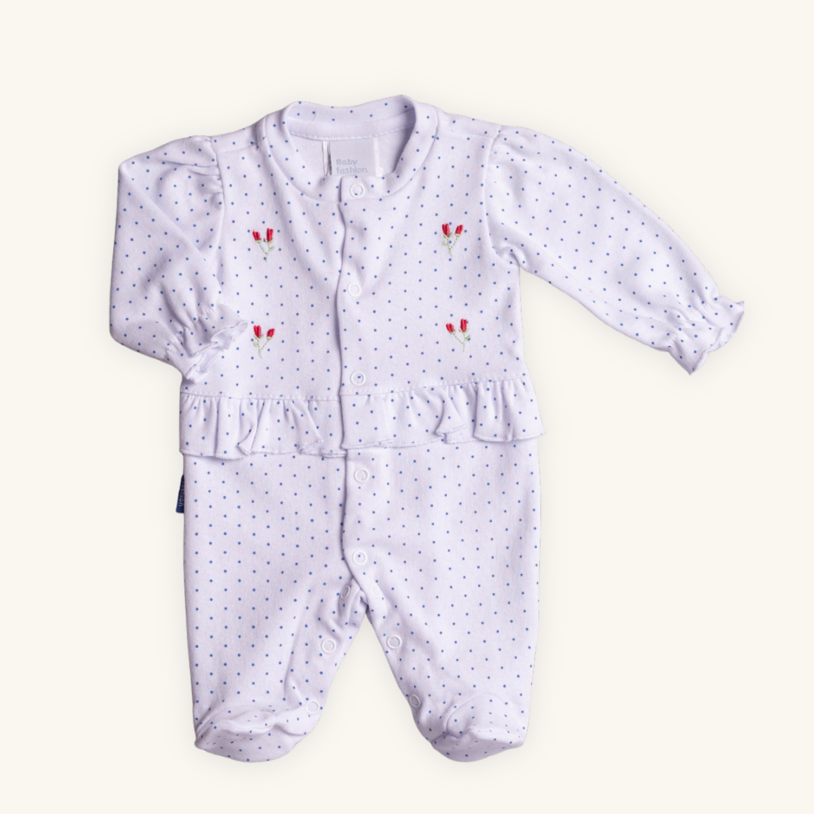 produzido artesanalmente em suedine premium 100% algodão, na cor branca, com estampa de pois azuis por toda a peça. Ela conta com bordados salpicados pela pala e um babado em meia malha na cintura que dá um charme muito legal.