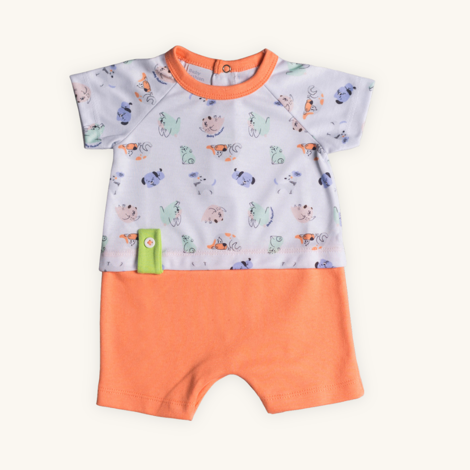 Confeccionado artesanalmente, a parte inferior em Suedine Premium 100% Algodão, garantindo suavidade e frescor para os dias mais quentes. Já a parte de cima tem estampa corrida com cachorrinhos exclusivos da Baby Fashion, feita em Suedine Mista com estampa em toque zero e acabamento impecável.