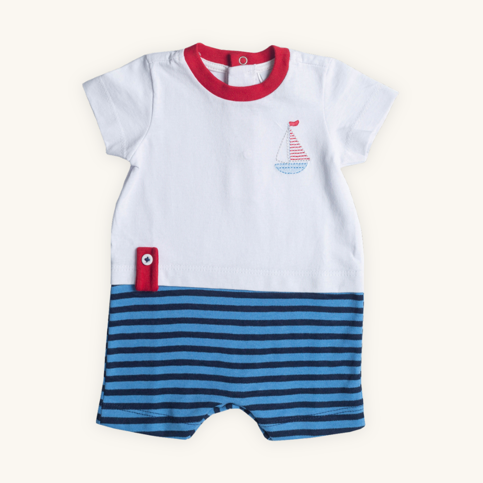 Confeccionado artesanalmente com dois tecidos nobres: a parte de cima em meia malha premium 100% algodão, e a parte de baixo em suedine premium 100% algodão. O bordado do barquinho é forrado no avesso, garantindo ainda mais cuidado com a pele do bebê.