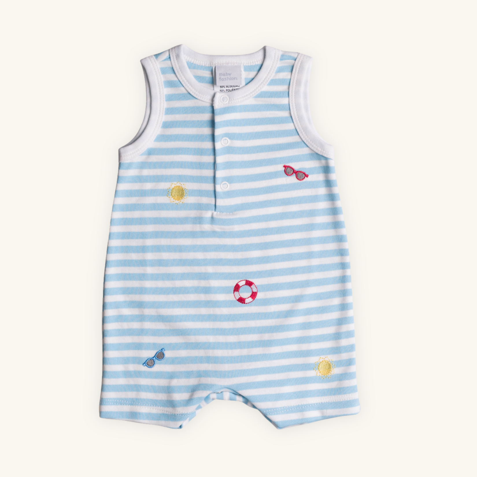Os bordadinhos com tema de praia (óculos, boias e solzinhos) trazem uma bossa especial, e são todos forrados com malha por dentro, protegendo a pele sensível do bebê.