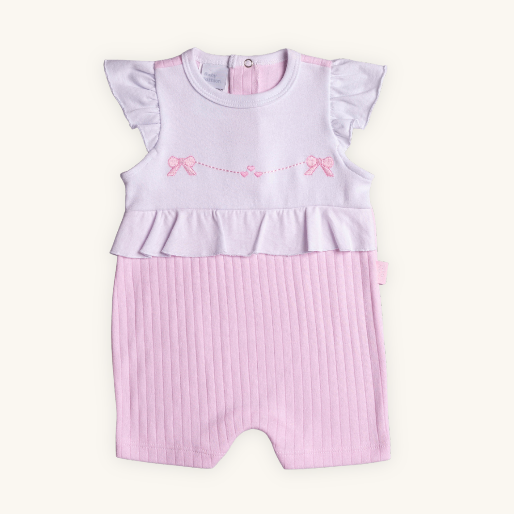 O charme deste macaquinho fica no babado na pala e mangas, e no bordado de lacinhos, que possui uma forração de malha interna para que o bordado nao entre em contato com a pele do bebê.