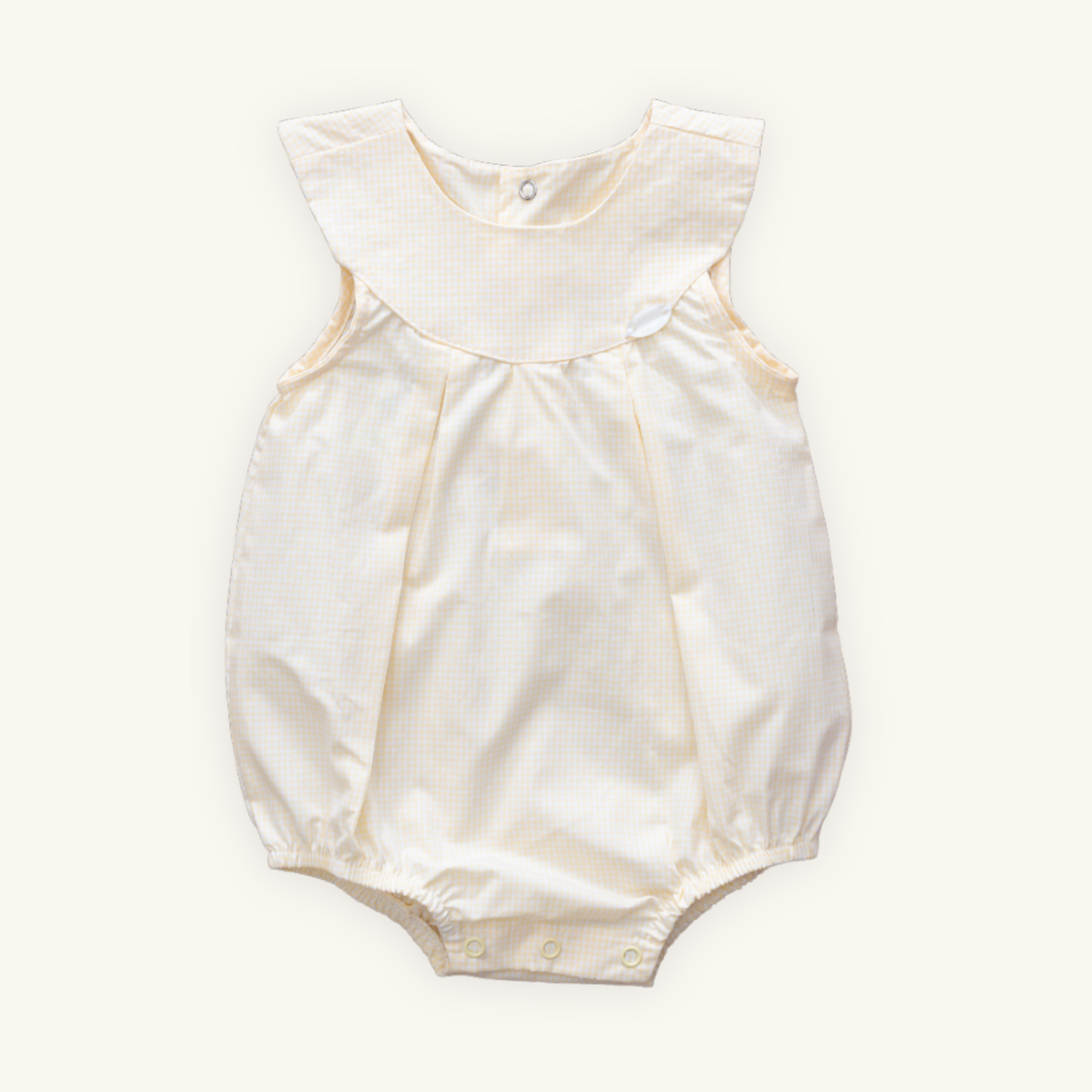 O romper é confeccionado artesanalmente em tecido plano xadrez miudo na cor amarelo, fazendo dele um produto elegante e delicado, tem um caimento perfeito e é extremamente confortável.