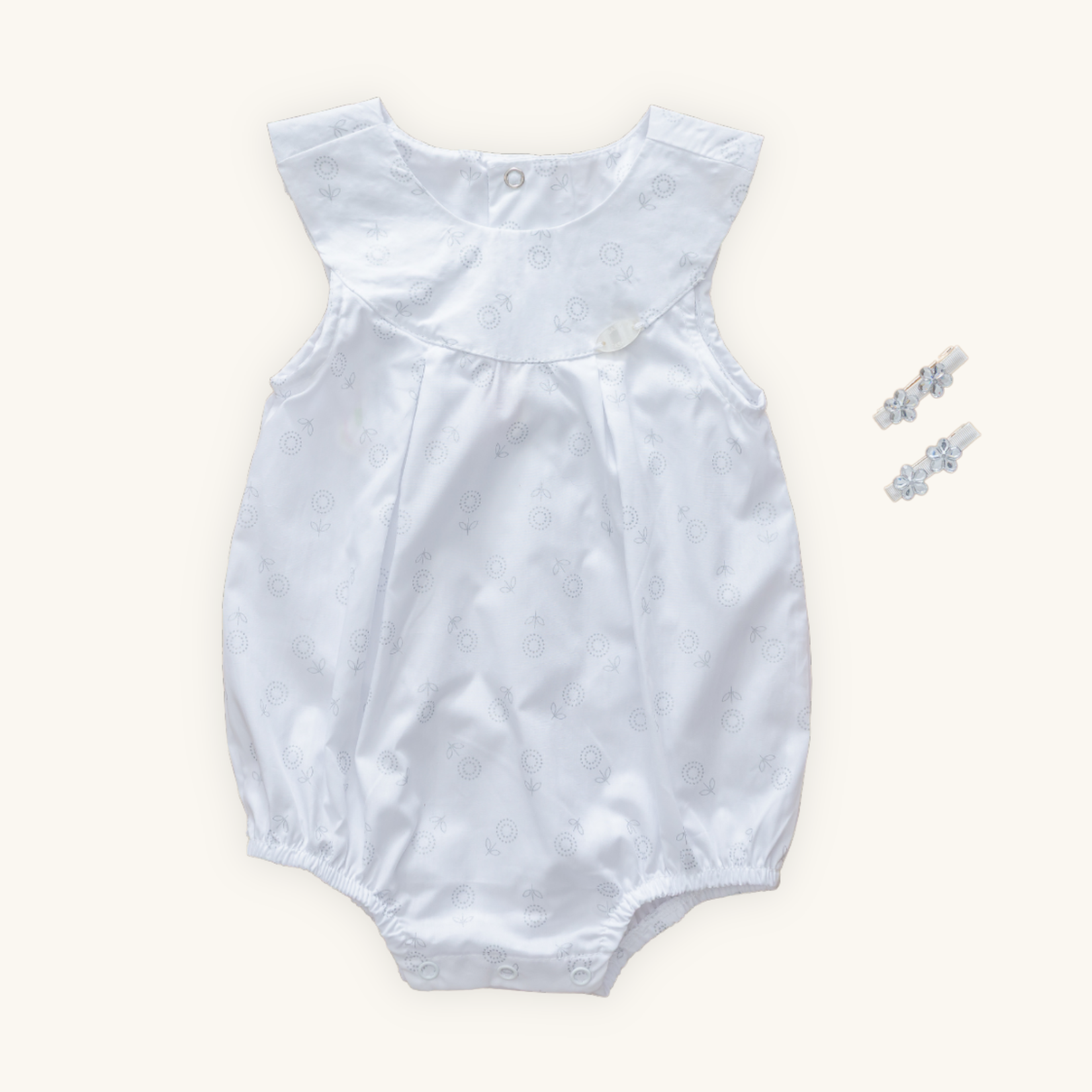 O romper é produzido artesanalmente em tecido plano na cor branca, com detalhes florais em prata, que o deixa elegante e delicado, tem um caimento perfeito e é extremamente confortável.