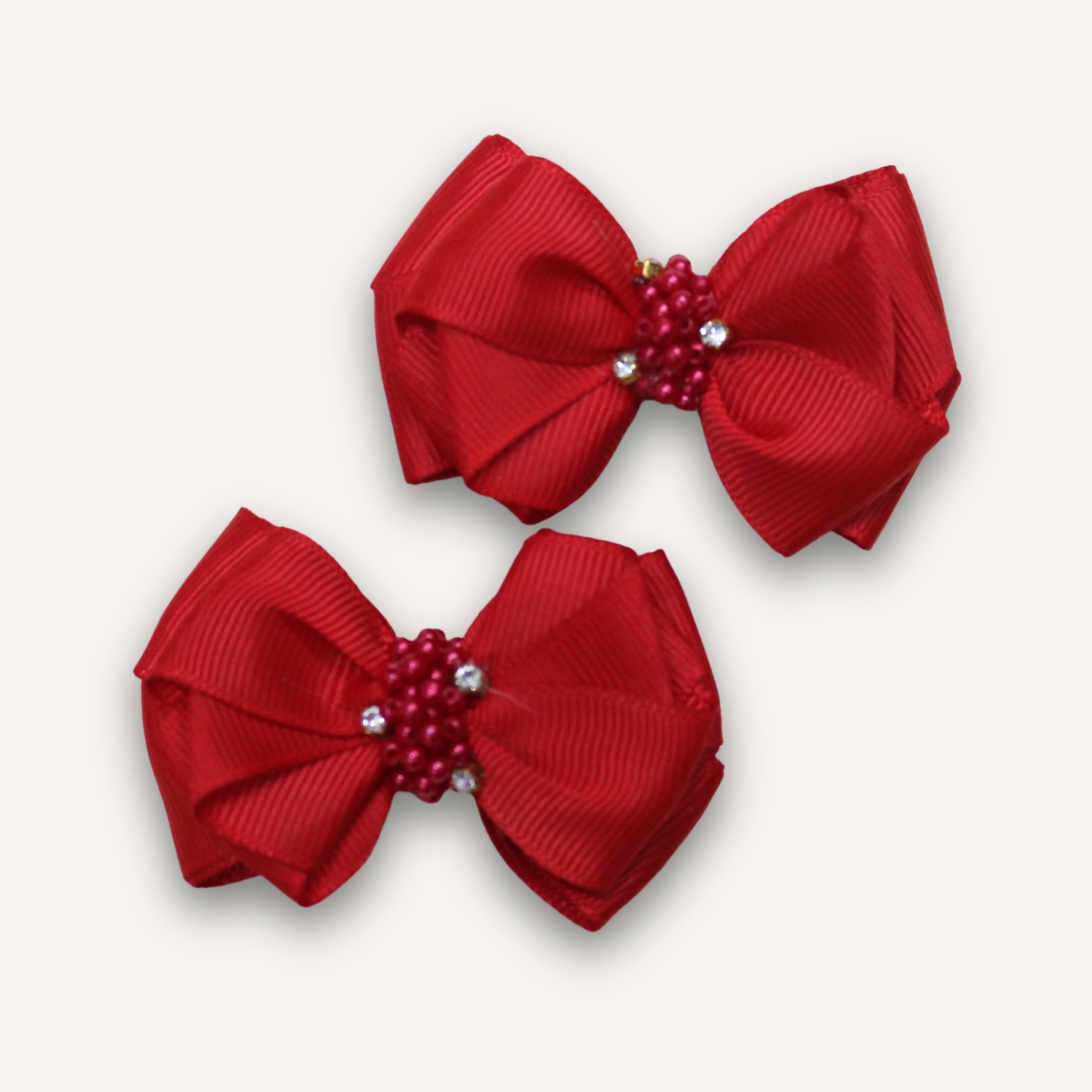 Feita em gorgurão de alta qualidade, a peça tem formato de laço duplo, no tom vermelho vibrante, e aplicação delicada de pérolas vermelhas com pontos de brilho que dão um toque sofisticado.