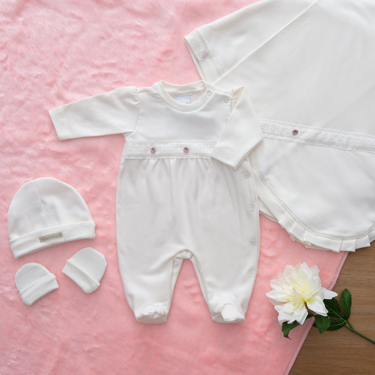 O macacão é confeccionado em Suedine Premium 100% algodão, com aplicação de renda e chiffon — um tule nobre — e pequenas flores aplicadas à mão, uma a uma, com muito amor. Acompanha uma manta no mesmo tema, perfeita para aquecer e encantar nos primeiros registros. Ela mede 80x80cm, tamanho ideal para fazer charutinhos com o bebê. Também acompanha kit de touca e luvas em suedine 100% Algodão.