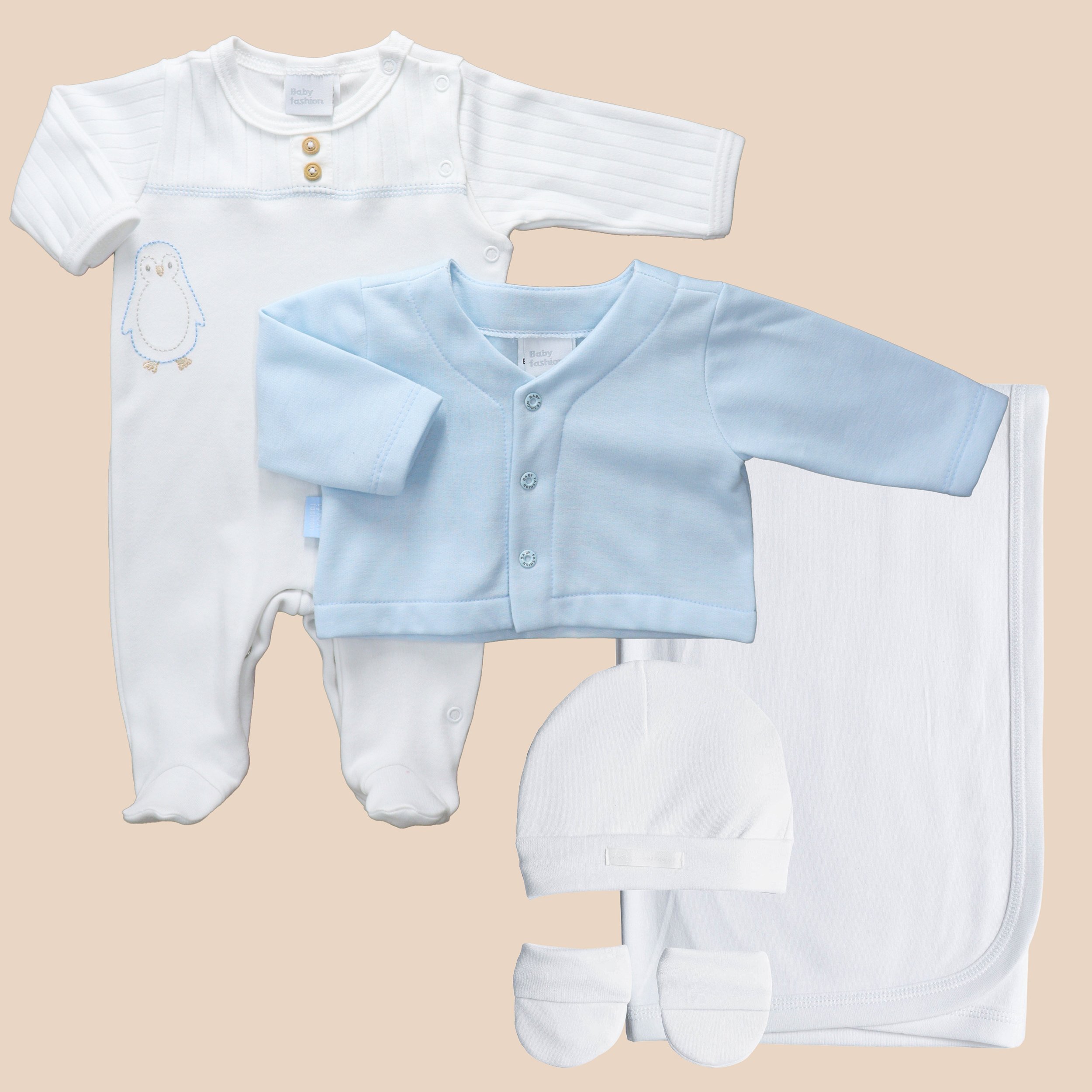 - Kit exclusivo 5 peças: Macacão, casaco, manta, touca e luvas em algodão premium.