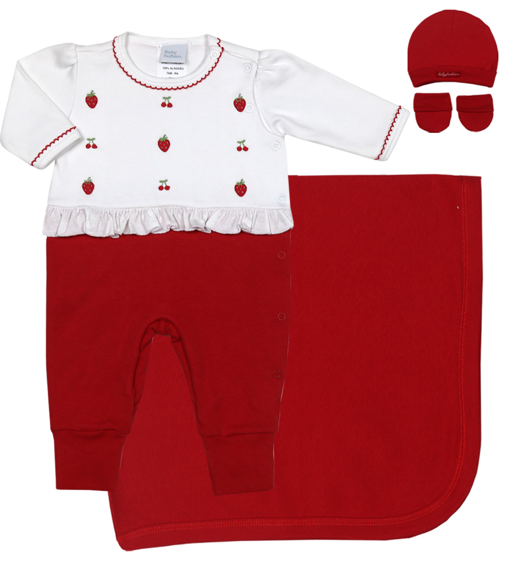 Este kit é bem moderno, o macacão com bordado de moranguinhos salpicados pela pala, deixa a peça bem estilosa.