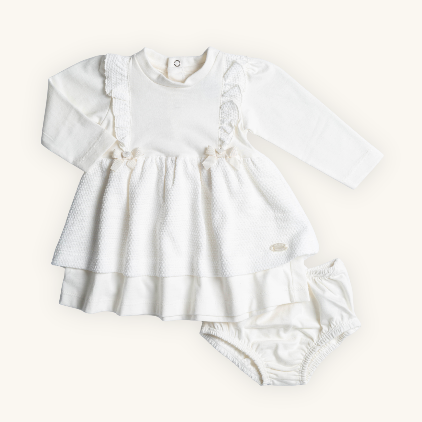 O forro e as mangas são confeccionados artesanalmente em malha Premium 100% Algodão, enquanto a sobressaia e os detalhes do vestido são produzidos artesanalmente em malha tricot 100% Algodão, garantindo um caimento fofo e sofisticado.